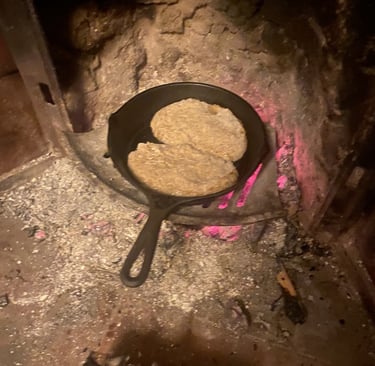 And there was a bonus. Paul is staying in place just down the road – a tiny little cottage like a doll’s house with a staircase in a cupboard. It has a lovely little fireplace and I got to indulge in one of my favorite pastimes, cooking on open fires. This is me making bread on his fire.
